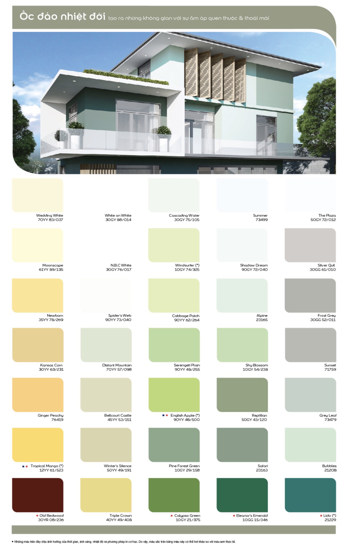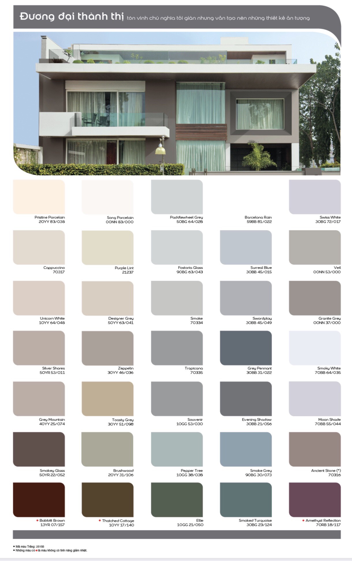 Danh mục tin BẢNG GIÁ BẢNG MÀU Bảng màu Dulux Bảng màu Nippon Bảng màu Jotun Bảng màu Kova TIN TỨC Tin tức nổi bậtBẢNG GIÁ TRỌN GÓI SƠN DULUXSáng tạo không gian sống theo phong cách riêngVì sao bạn nên sơn lại nhàPHỐI MÀU SƠN PHÒNG KHÁCH CỦA DULUX.10 ĐIỀU CẦN BIẾT KHI TIẾN HÀNH SƠN NỘI THẤTBẢNG GIÁ TRỌN GÓI SƠN NIPPON5 CÁCH PHỐI MÀU SƠN ĐẸP VÀ HIỆN ĐẠIChọn màu sơn nhà cho người mệnh MộcGợi ý chọn màu sơn cho phòng trẻ emPHƯƠNG PHÁP NHẬN BIẾT SẢN PHẨM DULUX VÀ MAXILITE CHÍNH HÃNGBảng màu sơn Dulux Weathershield ngoài trời 2023 , Ngày đăng : 06:19:38 12-08-2016